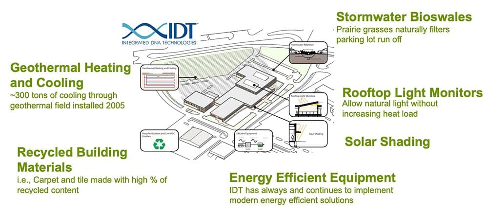 As we continue to expand and add new locations around the world, we work to improve our sites with sustainability in mind. In addition to the activities and initiatives within IDT, we also support our customers in their efforts to reduce environmental impacts of a diversity of manufacturing and industrial processes. Examples of these include the development of biofuels, synthetic food, textiles and dyeing processes, biosensors, renewable chemicals, biomaterials, and environmental remediation.