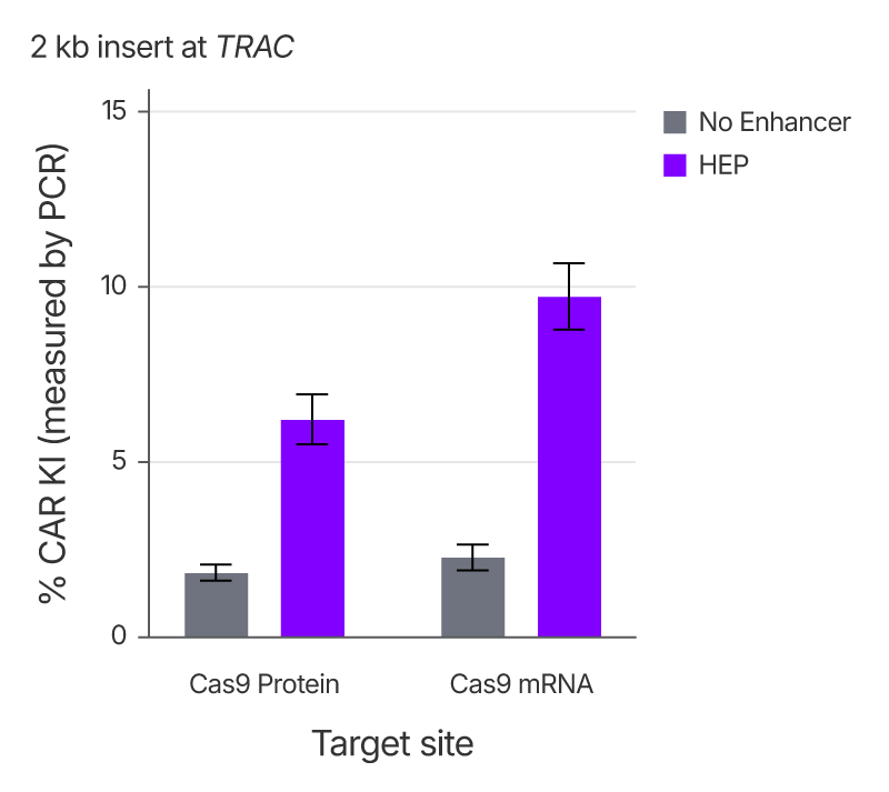 To evaluate the compatibility of HDR Enhancer Protein with different Cas9 delivery formats, we compared knock-in efficiency of an approximately 2 kb chimeric antigen receptor (CAR) sequence at the TRAC locus in HEK293 cells using either Cas9 mRNA or Cas9 RNP. In both formats, the addition of the enhancer resulted in a substantial increase in the knock-in rates, demonstrating its flexibility in diverse editing workflows.